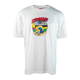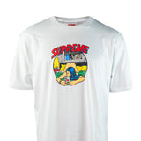 La Supreme Bedroom Tee en color blanco, perteneciente a la temporada SS25 y lanzada el 20 de febrero de 2025, presenta un diseño gráfico llamativo y narrativo en el pecho que muestra una ilustración estilo cómic de una escena en un dormitorio, con una figura femenina recostada sobre la cama usando su teléfono móvil, mientras el logo Supreme aparece destacado en la parte superior del arte en tipografía curva y colores vibrantes; confeccionada en algodón suave de alta calidad, con corte clásico, cuello redondo y espalda completamente lisa, esta camiseta combina el enfoque artístico provocador característico de la marca con una estética limpia y versátil, consolidándose como una pieza representativa del ADN visual y cultural de Supreme.