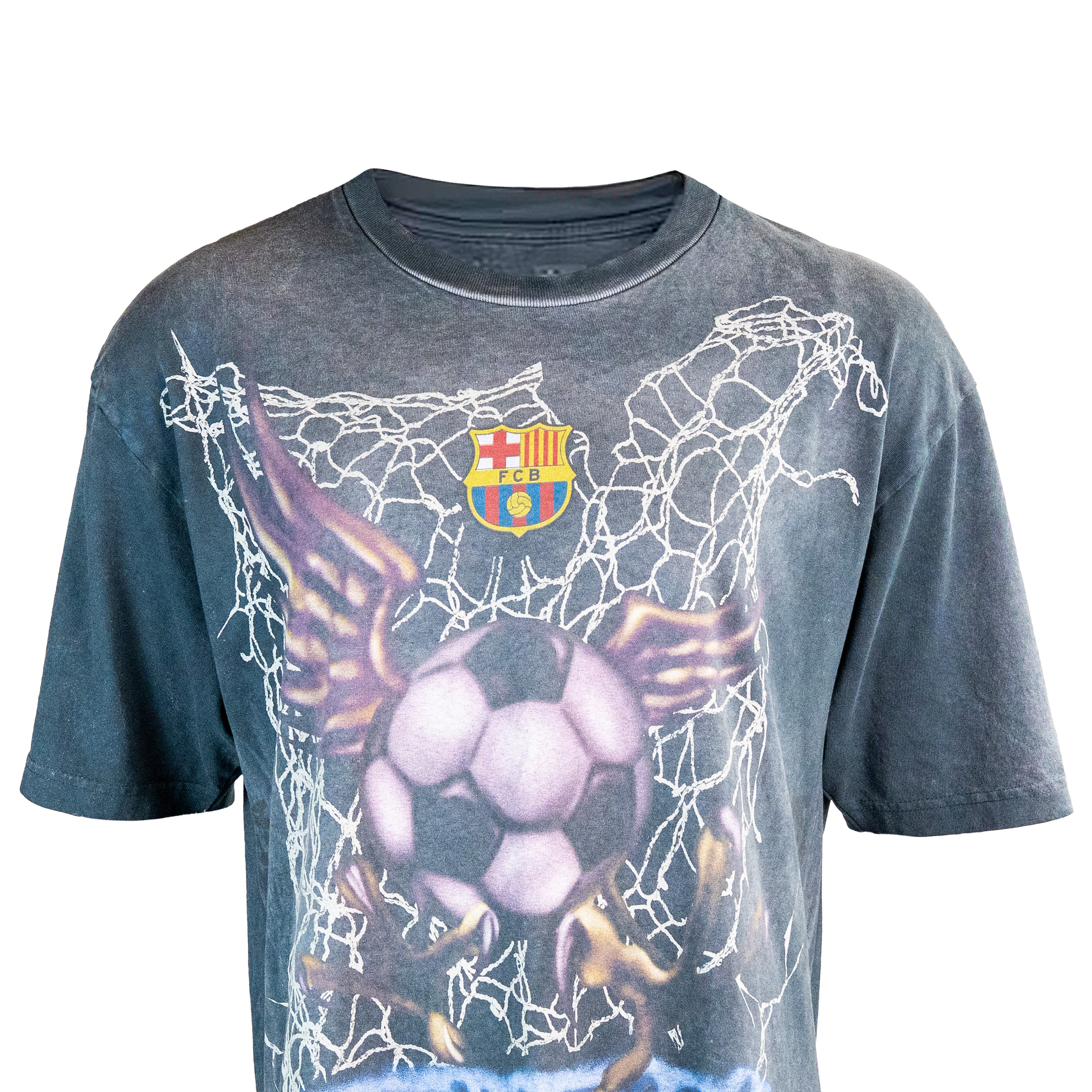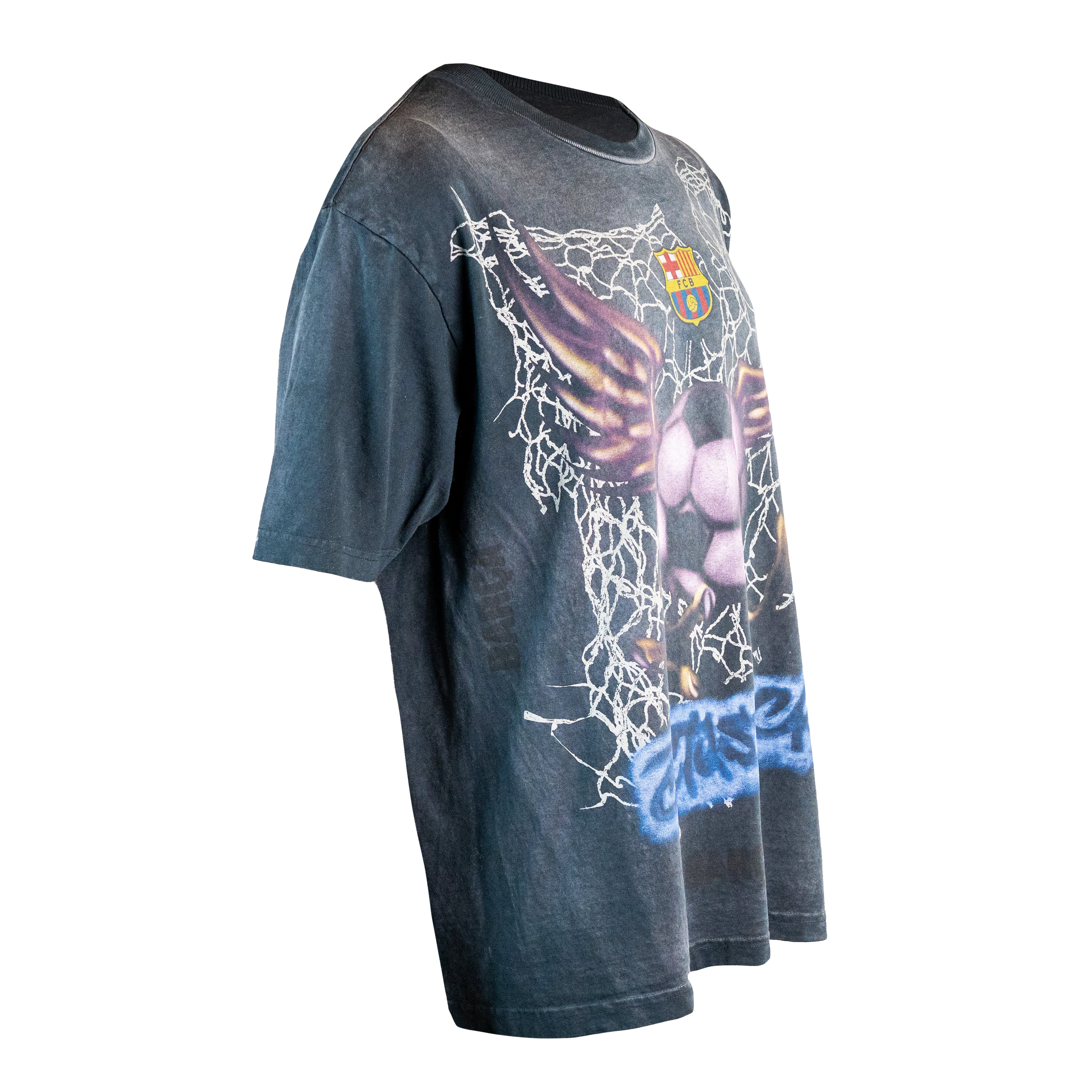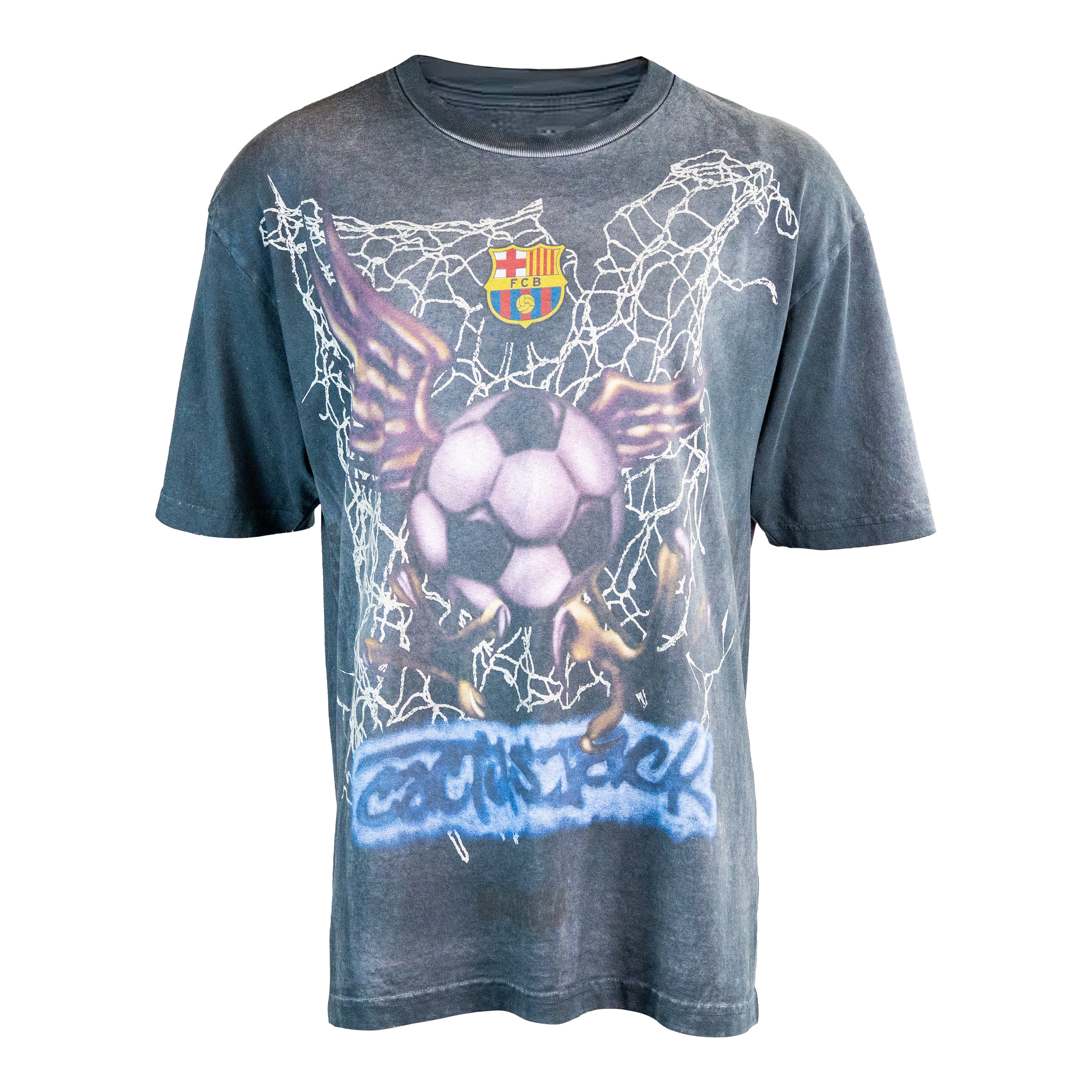 La Travis Scott x FC Barcelona Washed Spray Logo Tee combina la esencia rebelde del streetwear con la identidad icónica del club catalán. Confeccionada en algodón de alta calidad y tratada con un lavado envejecido, presenta un diseño gráfico de estilo aerógrafo que muestra un balón alado atrapado en una red bajo el escudo del FC Barcelona, acompañado de la firma inconfundible de Cactus Jack en la parte inferior. Su aspecto desgastado y su corte relajado evocan la estética vintage característica de Travis Scott. Lanzada el 9 de mayo de 2025 como parte de la temporada SS25, esta camiseta captura el espíritu de colaboración entre la moda, la música y la cultura futbolística.