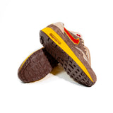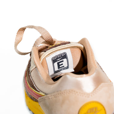 Las Nike Air Max 1 SWOOSH Low Poly Big Head Origins rinden homenaje a la nostalgia gamer con un diseño que evoca la estética pixelada de los videojuegos retro, combinando tonos chocolate claro, cáñamo y arena, realzados por un vibrante Swoosh rojo universitario.