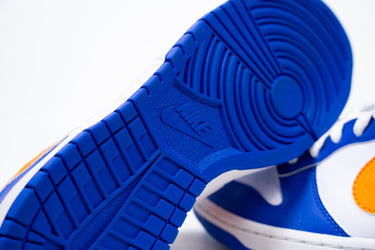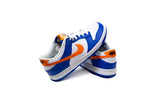El Nike Dunk Low Knicks es una zapatilla vibrante y llena de energía. Esta edición del icónico modelo presenta una base de cuero blanco suave, superposiciones en azul real y detalles en cuero naranja que rinden homenaje a los colores del equipo NBA New York Knicks. La entresuela de espuma blanca y la suela de goma azul real con patrón de tracción combinan estilo y funcionalidad. Lanzada el 30 de junio de 2023, esta zapatilla captura la esencia clásica del Dunk con un toque moderno y enérgico.