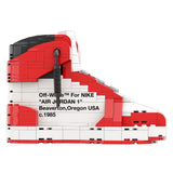 Fabricado en plástico ABS de alta calidad, este armable incluye entre 300 y 400 piezas que permiten recrear con precisión la combinación de colores rojo, blanco y negro característica del modelo Chicago, complementada con los elementos únicos de diseño de Off-White.