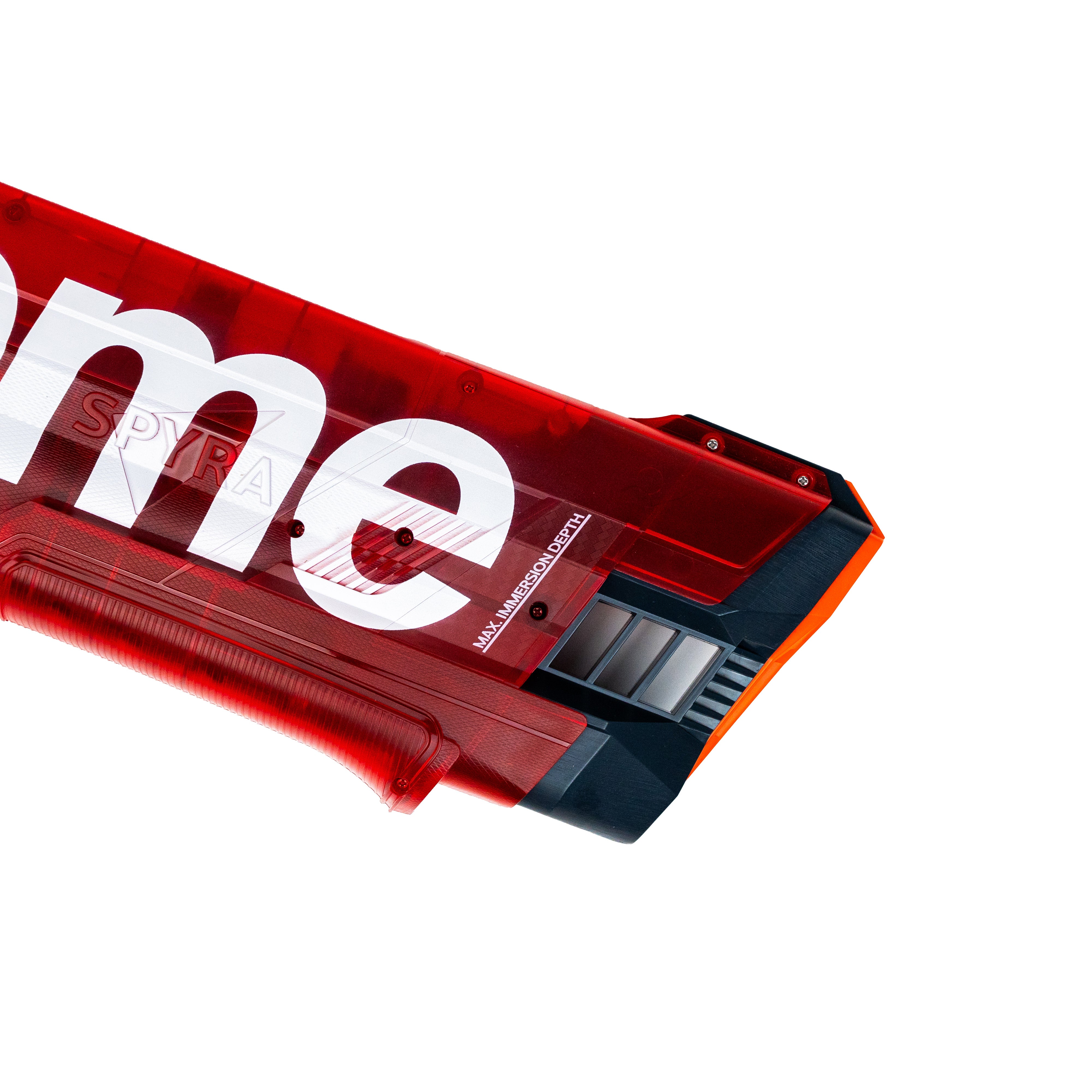 La Supreme SpyraThree Water Blaster en color rojo, lanzada el 10 de abril de 2025 como parte de la temporada SS25, combina diseño vanguardista con tecnología de alta precisión para redefinir las batallas acuáticas. Con un alcance efectivo de 35 pies y máximo de 50, esta blaster dispara hasta 22 chorros de agua por carga, mientras que su batería integrada ofrece una autonomía de 100 recargas o 2,200 disparos totales. Todo esto se concentra en un cuerpo aerodinámico de 66,5 cm de largo, 9,7 cm de alto y 9,6 cm de ancho, pensado para ofrecer tanto estilo como rendimiento.