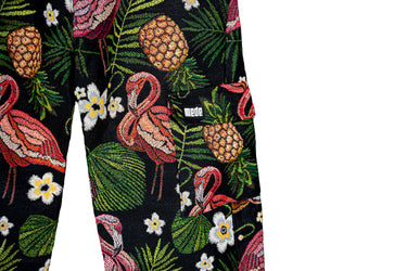 El CARGO PANT FLAMENCOS, de la exclusiva marca Mede, destaca por su llamativo estampado de flamencos rosados entrelazados con vibrantes piñas y flores, ofreciendo una pieza verdaderamente exclusiva que combina originalidad y elegancia, y que, sin duda, no puede faltar en tu colección.