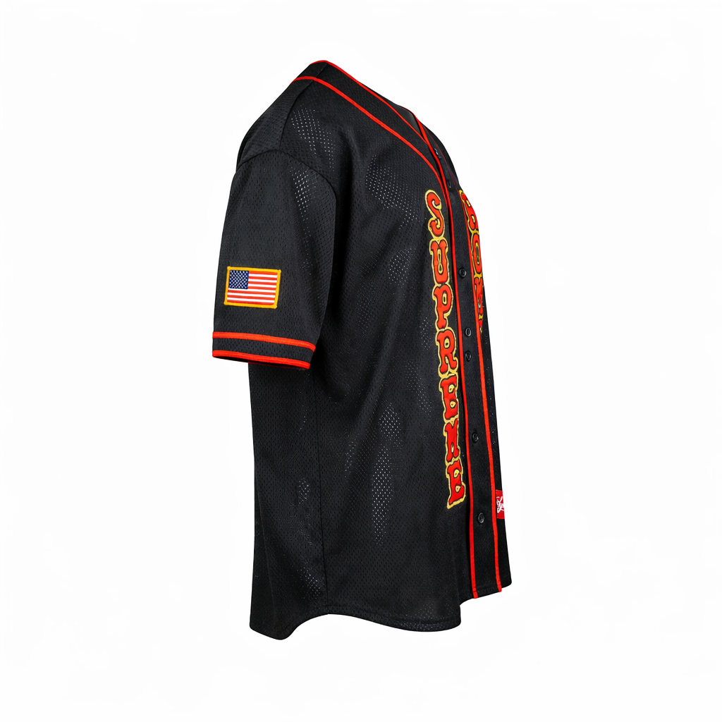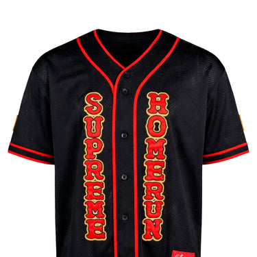 La Supreme Homerun Baseball Jersey en color negro, correspondiente a la temporada SS25, es una pieza que fusiona la estética clásica del béisbol con la identidad audaz de la marca, destacando por su diseño llamativo con tipografías bordadas en tonos rojos y dorados que recorren el frente y la espalda, aportando un aire vintage y contundente; confeccionada en tejido ligero y transpirable, presenta detalles cuidados como ribetes contrastantes, cierre frontal de botones y parches que refuerzan su carácter deportivo y urbano, convirtiéndola en una prenda versátil y protagonista para quienes buscan estilo y presencia en cada outfit, lanzada oficialmente el 15 de mayo de 2025.