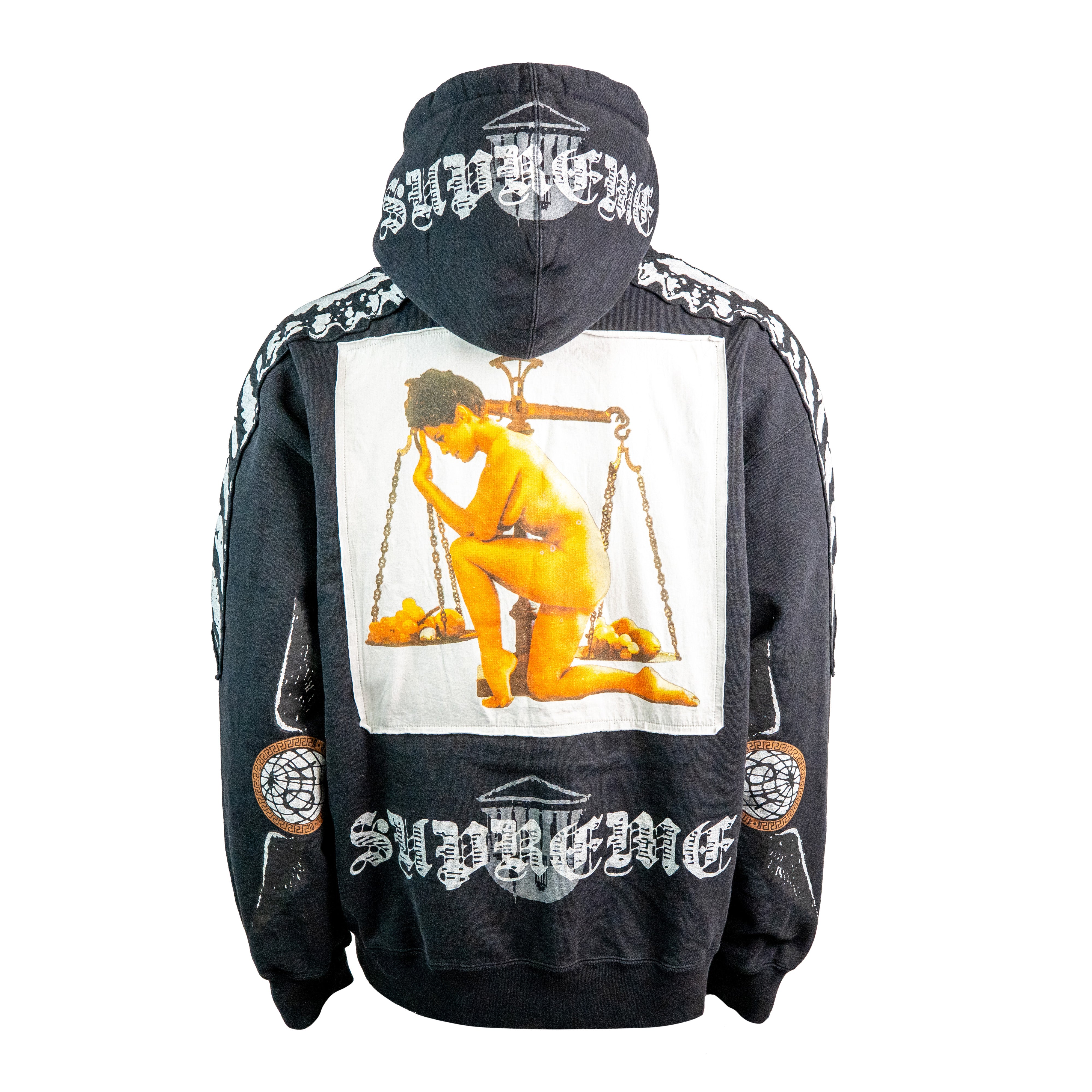 La Supreme Wings Zip Up Hooded Sweatshirt (FW25) fusiona arte clásico y estética callejera en una prenda que no pasa desapercibida. Confeccionada en algodón premium, destaca por su imponente gráfico trasero que muestra una figura dorada en balanza, evocando equilibrio y reflexión, enmarcada por detalles góticos y el logotipo de Supreme en tipografía ornamental. Los estampados a lo largo de las mangas y el capó refuerzan su carácter expresivo, convirtiéndola en una sudadera que combina rebeldía, sofisticación y una fuerte carga simbólica al puro estilo Supreme.